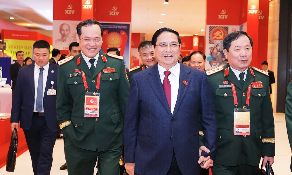 Thủ tướng Phạm Minh Chính và hai thượng tướng, Thứ trưởng Quốc phòng Vũ Hải Sản (bên trái) và Lê Huy Vịnh (bên phải), đến tham dự Đại hội Đảng XIV. |