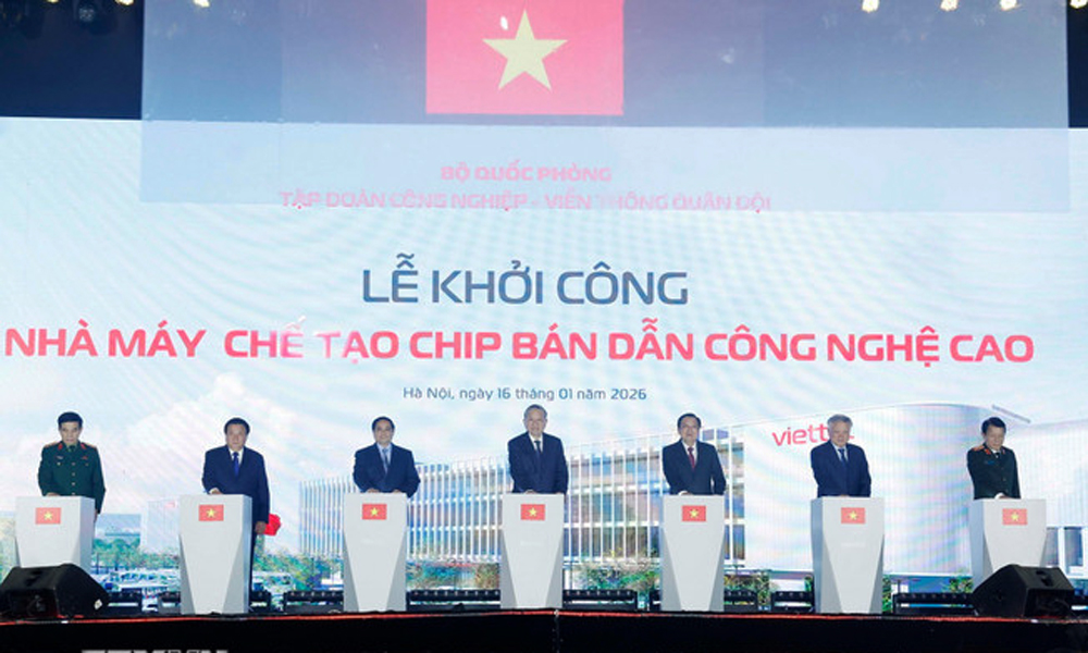 Tổng Bí thư Tô Lâm, Thủ tướng Phạm Minh Chính và các đại biểu phát lệnh khởi công Nhà máy chế tạo Chip bán dẫn công nghệ cao. |