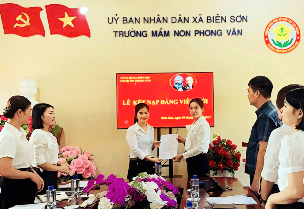 Đại diện Chi ủy Chi bộ Trường Mầm non Phong Vân trao quyết định kết nạp cho đảng viên mới. |