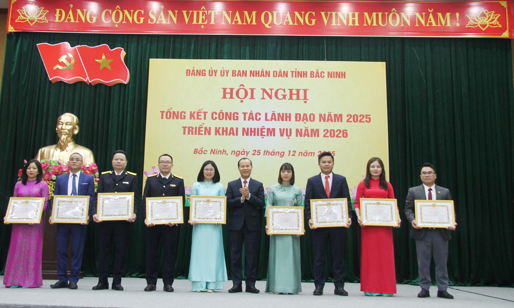 Tại hội nghị, Ban Thường vụ Đảng ủy UBND tỉnh khen thưởng 11 chi, đảng bộ hoàn thành xuất sắc nhiệm vụ năm 2025 và 20 đảng viên hoàn thành xuất sắc nhiệm vụ tiêu biểu 5 năm liền.