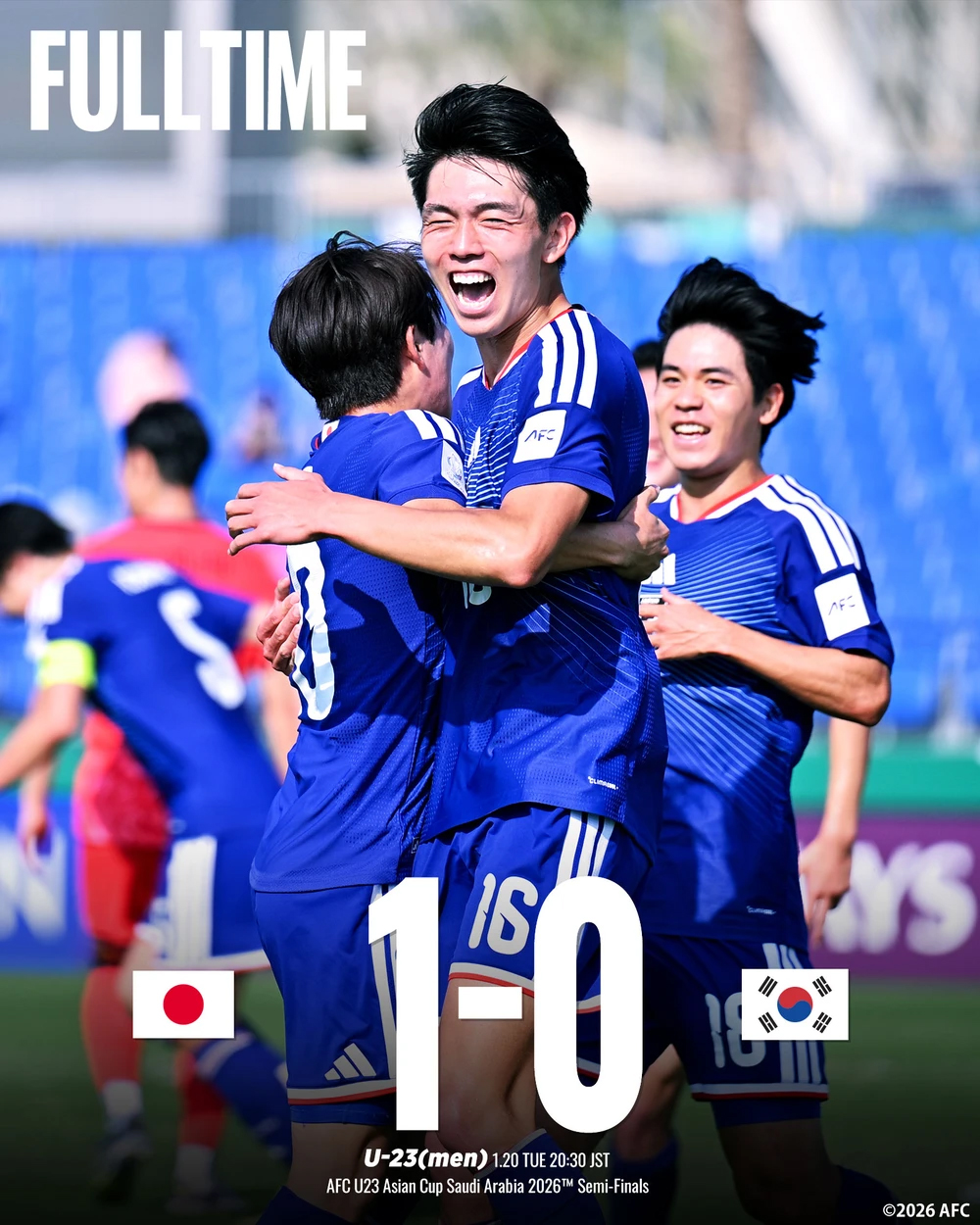 Trong khuôn khổ bán kết giải U23 châu Á 2026, U23 Nhật Bản đã giành chiến thắng tối thiểu 1-0 trước U23 Hàn Quốc, qua đó chính thức giành vé vào trận chung kết U23 châu Á - 2026. Dù đã có những phút cuối đầy nỗ lực nhưng U23 Hàn Quốc không thể tìm được bàn gỡ, chấp nhận chơi trận tranh hạng ba.