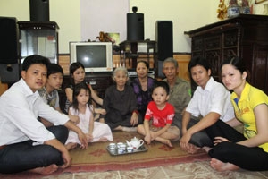 Gia đình cụ Nguyễn Thị Sắc ở thôn Gai, xã Xuân Hương (Lạng Giang) quây quần bên nhau. |
