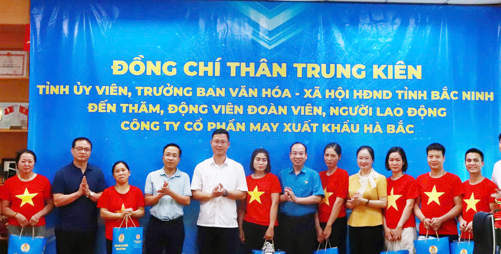 BẮC NINH - Chiều 8/4, đoàn công tác của tỉnh do đồng chí Thân Trung Kiên, Tỉnh ủy viên, Trưởng Ban Văn hóa - Xã hội, HĐND tỉnh làm trưởng đoàn đến thăm, làm việc tại Công ty cổ phần May xuất khẩu Hà Bắc (phường Việt Yên) và tặng quà công nhân lao động hoàn cảnh khó khăn. Cùng đi có đại diện lãnh đạo Liên đoàn Lao động tỉnh, phường Việt Yên.