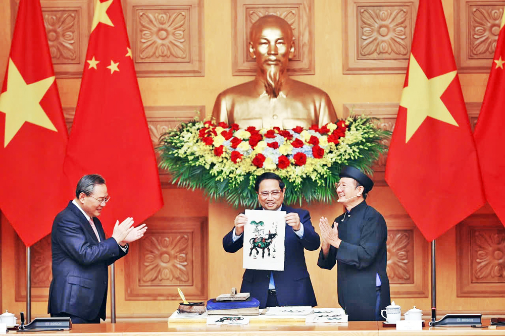 Nghệ nhân Nguyễn Hữu Hoa giới thiệu, hướng dẫn Thủ tướng Chính phủ Phạm Minh Chính và Thủ tướng Trung Quốc Lý Cường in tranh dân gian Đông Hồ. |