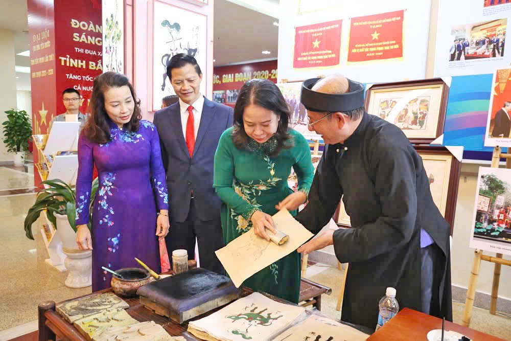Phó Chủ tịch nước Võ Thị Ánh Xuân và các đồng chí lãnh đạo tỉnh trải nghiệm kỹ thuật in tranh dân gian Đông Hồ tại gian trưng bày hình ảnh, tư liệu chào mừng Đại hội Thi đua yêu nước tỉnh Bắc Ninh lần thứ I, giai đoạn 2025 - 2030 (tháng 9/2025). |