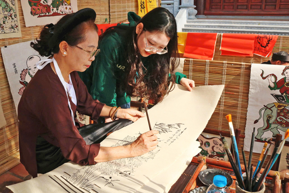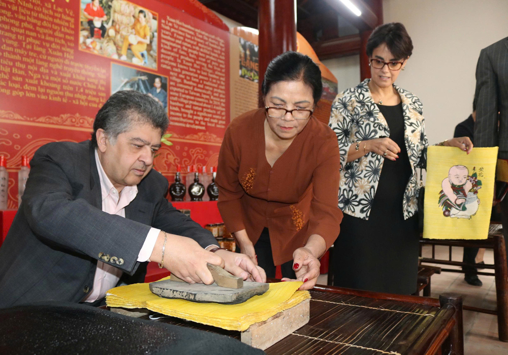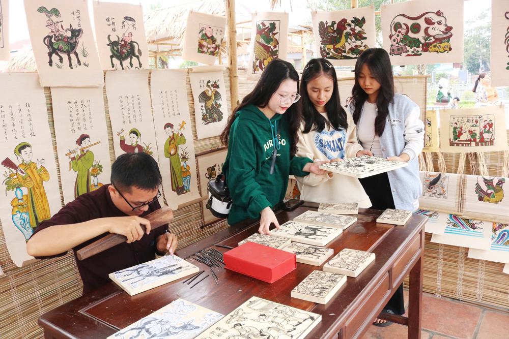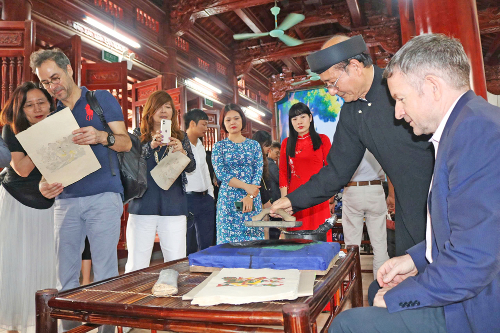 Du khách quốc tế trải nghiệm in tranh tại Trung tâm Bảo tồn tranh dân gian Đông Hồ (phường Thuận Thành). |