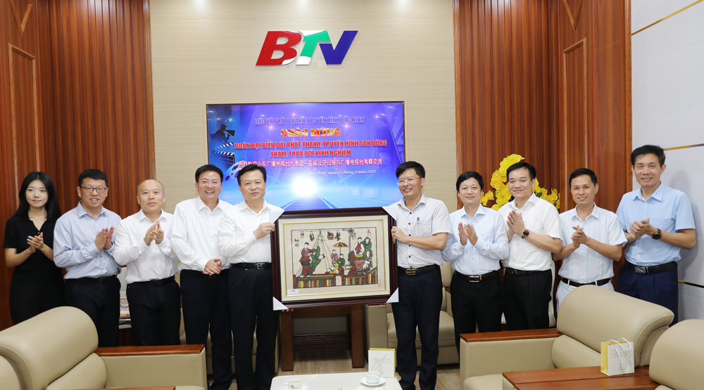 Đại diện lãnh đạo Báo và Phát thanh, Truyền hình Bắc Ninh tặng bức tranh dân gian Đông Hồ cho đoàn công tác Đài Phát thanh, Truyền hình Sơn Đông (Trung Quốc) trong chuyến thăm, trao đổi kinh nghiệm về công tác tuyên truyền. |