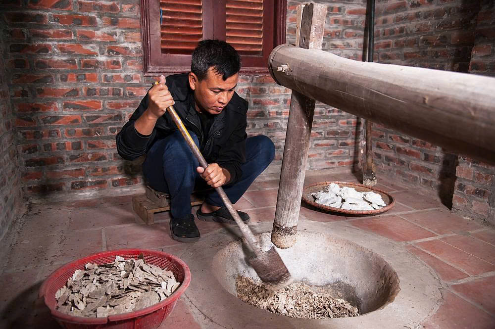 Chất liệu giấy và các màu sắc in tranh Đông Hồ hoàn toàn lấy từ thiên nhiên. Trong ảnh: Nghệ nhân Nguyễn Đăng Tâm (con trai Nghệ nhân Ưu tú Nguyễn Đăng Chế) giã vỏ sò điệp tại xưởng sản xuất tranh của gia đình ở khu phố Đông Khê, phường Thuận Thành. |