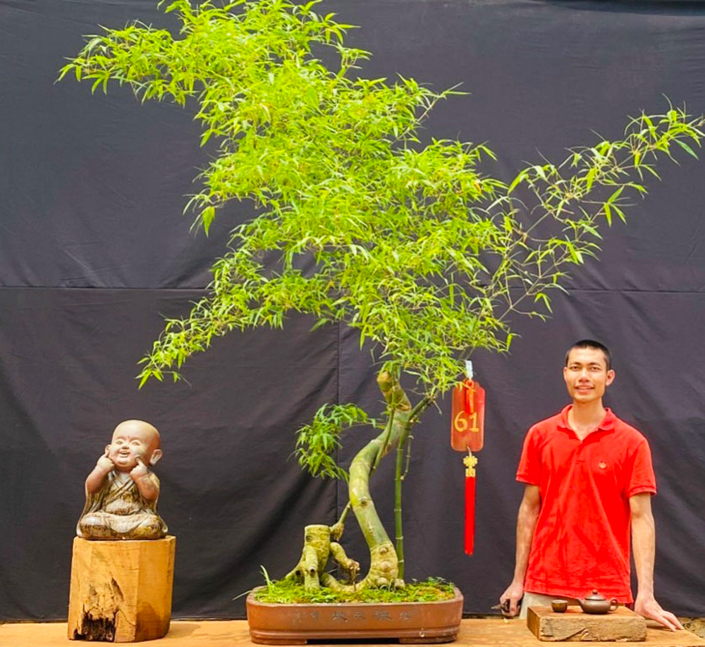 Anh Nguyễn Sỹ Luân bên tác phẩm tre bonsai. |