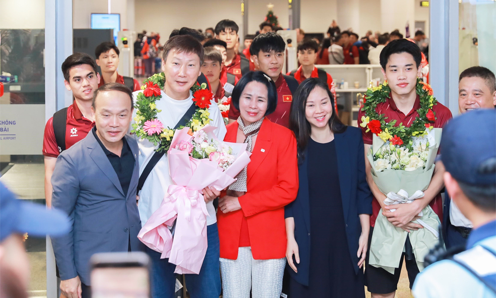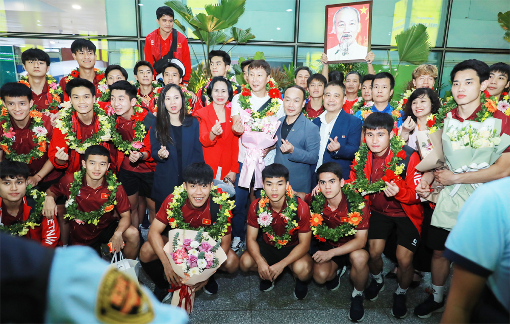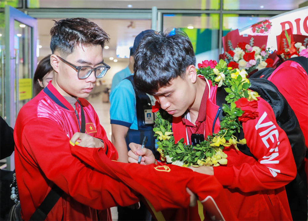 Đón đội tuyển tại sân bay có bà Lê Thị Hoàng Yến, Phó Cục trưởng Cục Thể dục Thể thao Việt Nam, ông Nguyễn Văn Phú - Tổng thư ký Liên đoàn Bóng đá Việt Nam cùng đông đảo người hâm mộ.