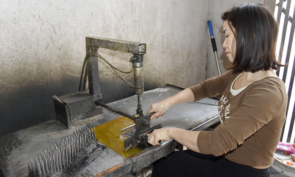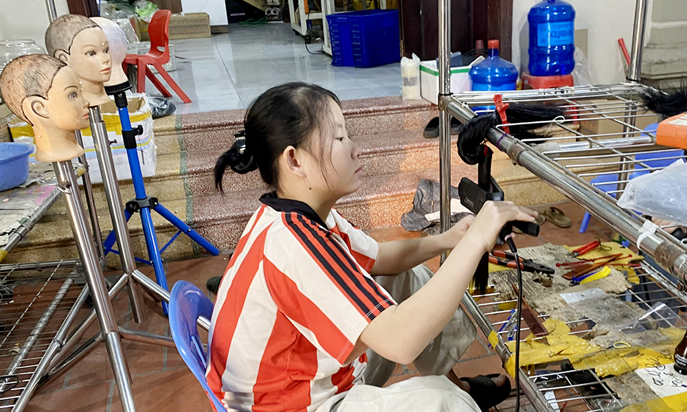 Cách đó không xa, tận dụng khoảng sân trước nhà, chị Nguyễn Thị Ngoan đang thực hiện sơ chế tóc rối, đây là công đoạn ban đầu trong quy trình làm một bộ tóc giả. Đầu tiên, chị Ngoan đưa tóc vào bàn chông để gỡ rối, sau đó dùng dầu xả chải cho tóc mềm, mượt, sấy khô và buộc thành từng mớ nhỏ rồi cung cấp cho các cơ sở chuyên sâu về làm tóc thẩm mỹ. Vì số vốn nhỏ, gia đình chị Ngoan chỉ thu mua tóc rối nguyên liệu với giá thành rẻ rồi về thực hiện các công đoạn xử lý cho tóc thẳng. Công đoạn này không đòi hỏi nhiều về thiết bị và tay nghề nhưng lại cần nhất sự kiên trì.