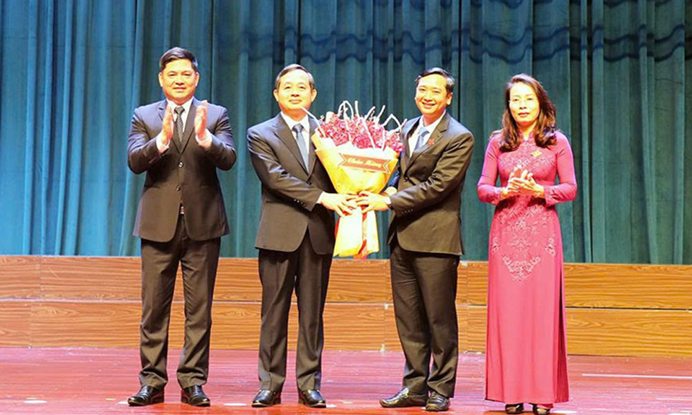 Đồng chí Nghiêm Xuân Hưởng tặng hoa chúc mừng Đại hội. |
