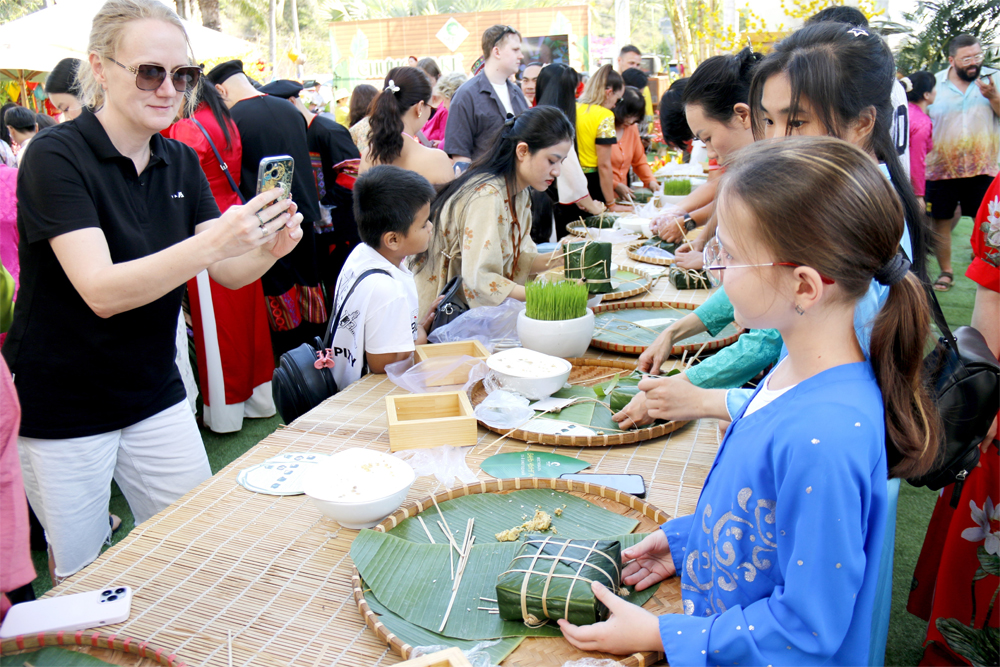 Du khách quốc tế với trang phục truyền thống của các dân tộc Việt Nam hào hứng gói bánh chưng lá dong. |