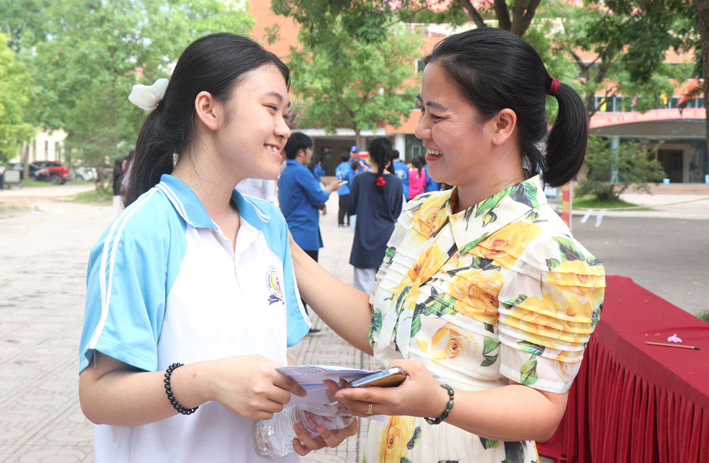 Chị Đặng Thị Thu Hiền ở xã Việt Tiến (thị xã Việt Yên) động viên con sau khi hoàn thành bài thi. |