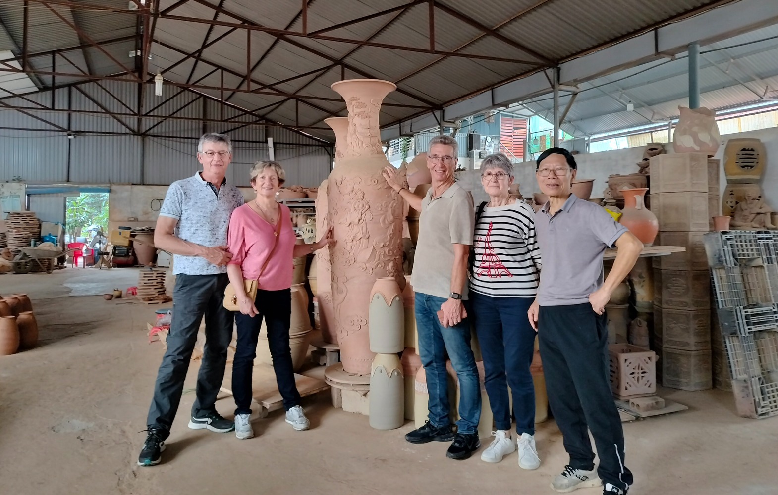 Du khách nước ngoài thích thú bên những sản phẩm gốm ở làng nghề Phù Lãng.