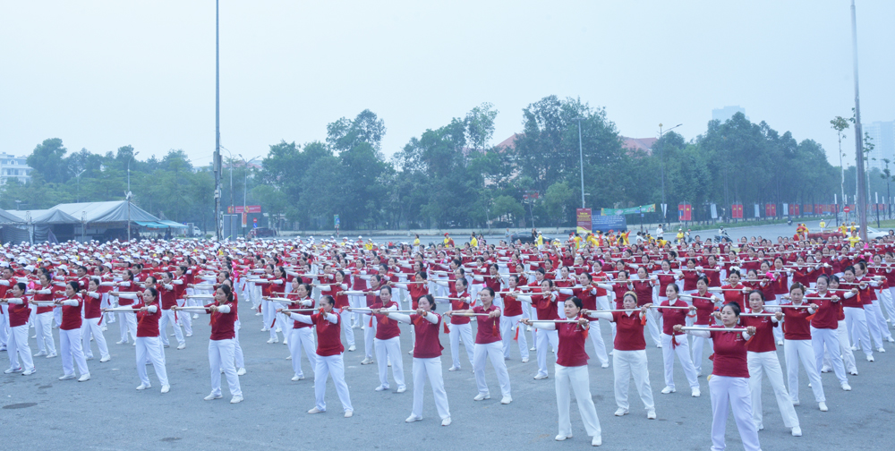 Chương trình đồng diễn dưỡng sinh có sự tham gia của gần 2.500 môn sinh, hội viên đến từ các câu lạc bộ dưỡng sinh, dân vũ trên địa bàn tỉnh. Mở đầu là màn biểu diễn trống hội Thăng Long, tiếp đó là các phần đồng diễn dưỡng sinh, dân vũ, múa quạt, võ thuật.