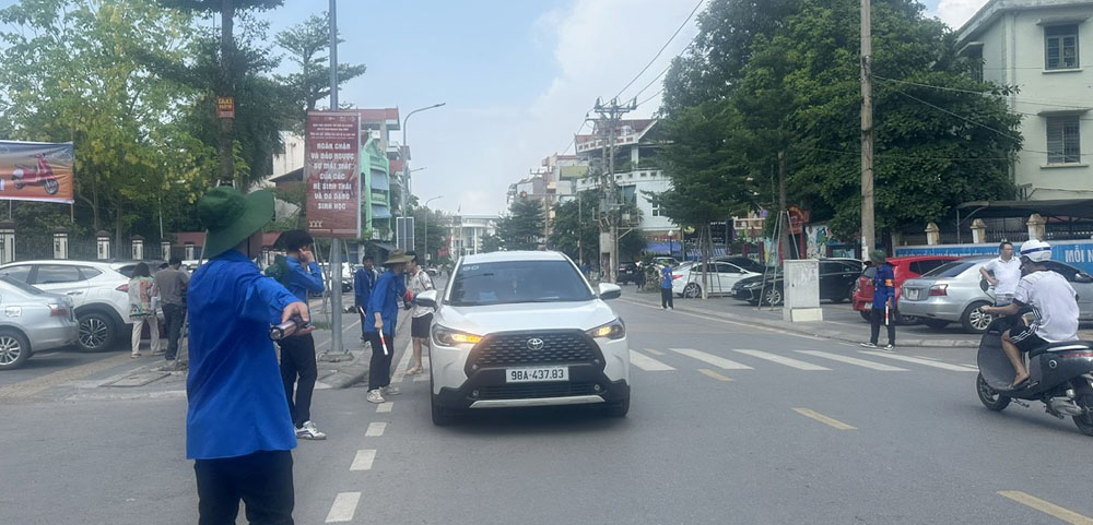 Hướng dẫn phương tiện giao thông di chuyển tại khu vực cổng Trường THPT Ngô Sĩ Liên (TP Bắc Giang), tránh ùn tắc. |