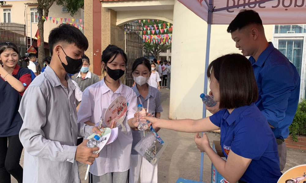 Thanh niên tình nguyện tại Hội đồng thi Trường THPT Tân Yên 2 tặng nước cho thí sinh. |