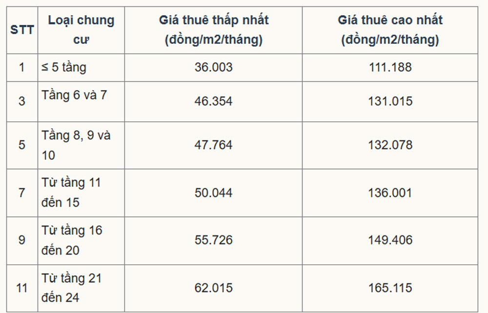 Tính theo đơn giá, chung cư nhà ở xã hội dưới 5 tầng, không hầm có mức thuê 36.000-95.100 đồng một m2 mỗi tháng.