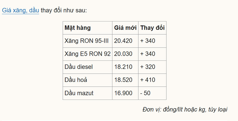 Giá xăng RON 95-III (loại phổ biến trên thị trường) tăng 340 đồng, lên 20.420 đồng một lít. E5 RON 92 thêm 340 đồng, ở mức 20.030 đồng.