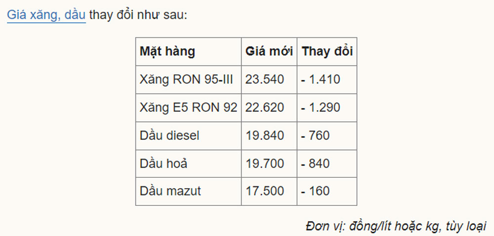 Theo điều hành của liên Bộ Công Thương - Tài chính hôm nay, giá xăng RON 95-III (loại phổ biến trên thị trường) giảm 1.410 đồng, xuống 23.540 đồng một lít. Xăng E5 RON 92 còn 22.620 đồng một lít, hạ 1.290 đồng.