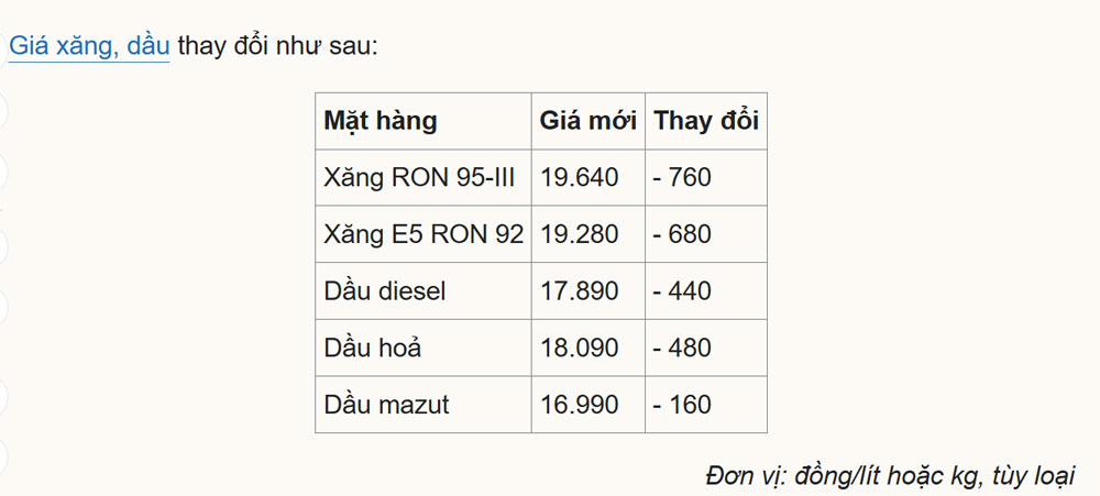 Tương tự, các mặt hàng dầu hạ 160-480 đồng một lít. So với cách đây 7 ngày, dầu diesel giảm 440 đồng, xuống 17.890 đồng. Dầu hỏa và mazut lần lượt có giá mới 18.090 đồng và 16.990 đồng.