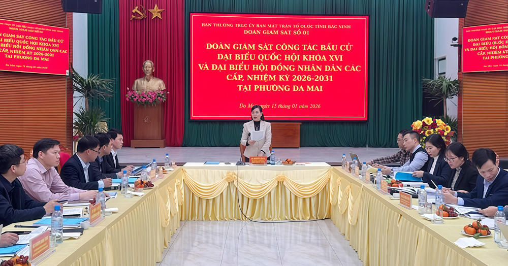 BẮC NINH - Ngày 15/1, Đoàn giám sát số 1 của Ban Thường trực Ủy ban MTTQ tỉnh Bắc Ninh do đồng chí Nguyễn Thị Hà, Ủy viên Ban Thường vụ Tỉnh uỷ, Chủ tịch Ủy ban MTTQ tỉnh, Phó Chủ tịch Ủy ban Bầu cử tỉnh làm trưởng đoàn thực hiện giám sát công tác bầu cử đại biểu Quốc hội khoá XVI và đại biểu HĐND các cấp, nhiệm kỳ 2026-2031 tại các phường: Đa Mai, Cảnh Thuỵ.
