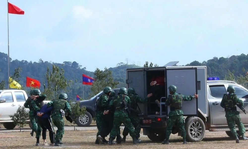 Lực lượng biên phòng Lóng Sập (Việt Nam) và lực lượng biên phòng Hủa Phăn (Lào) diễn tập liên hợp bắt tội phạm ma túy. |