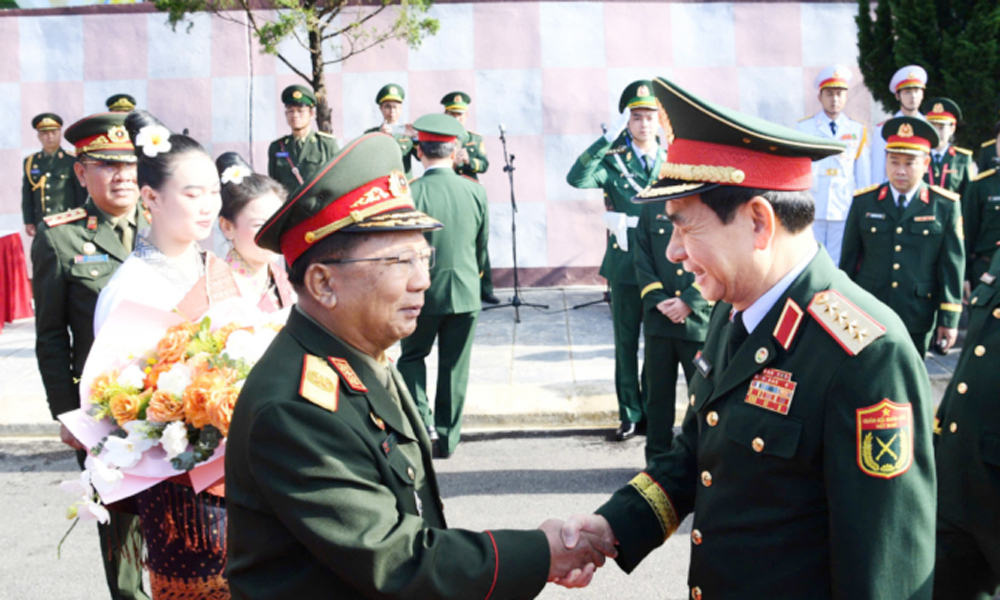 Bộ trưởng Bộ Quốc phòng hai nước Việt Nam và Lào gặp gỡ tại chương trình giao lưu. |