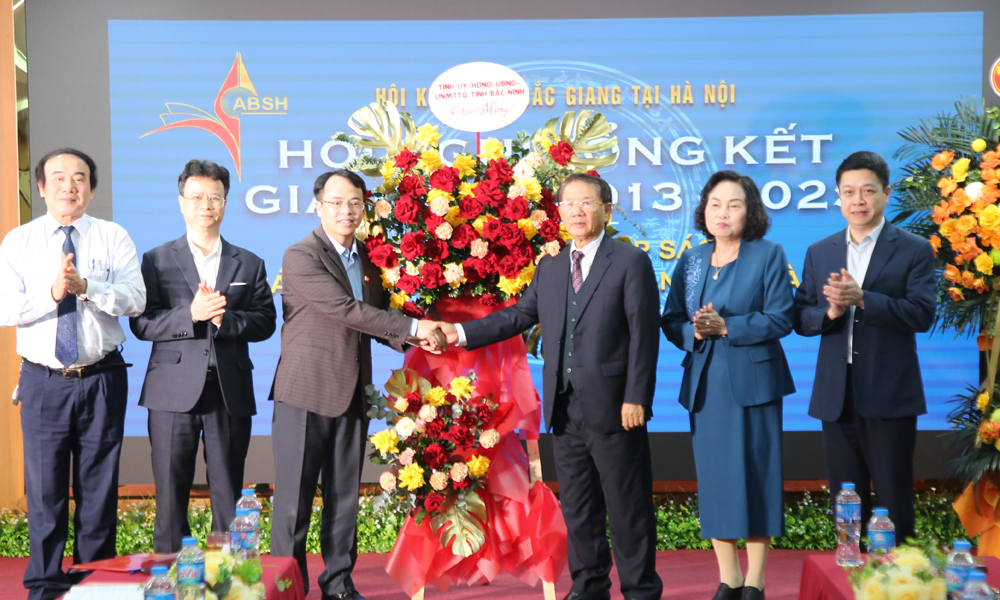 Lãnh đạo Sở Khoa học và Công nghệ Bắc Ninh tặng hoa chúc mừng Hội Khoa học tỉnh tại Hà Nội. |