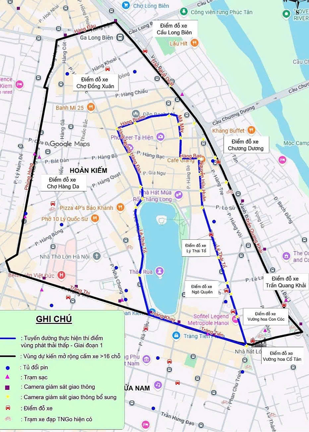 Cụ thể, vùng phát thải thấp giới hạn trong 11 tuyến phố thuộc phường Hoàn Kiếm gồm: Tràng Tiền, Hàng Khay, Lê Thái Tổ, Hàng Đào, Hàng Ngang, Hàng Buồm, Mã Mây, Hàng Bạc, Hàng Mắm, Nguyễn Hữu Huân, Lý Thái Tổ. Khu vực này rộng 0,5 km2, chu vi 3,5 km, dân số khoảng 20.000.
