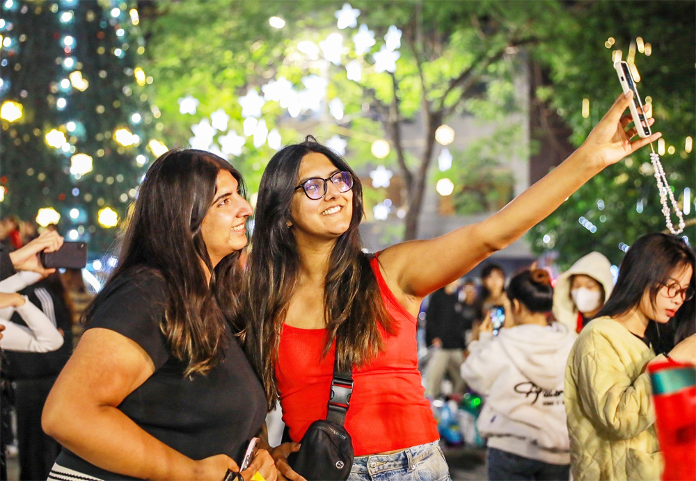 Các bạn trẻ vui vẻ chụp ảnh trong không khí rộn ràng mùa Giáng sinh. |