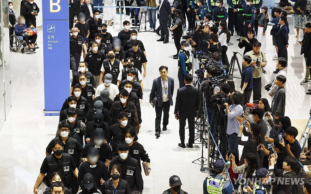 Các công dân Hàn Quốc liên quan đến hoạt động tội phạm công nghệ cao được trao trả về nước ngày 18/10. (Ảnh: Yonhap) |