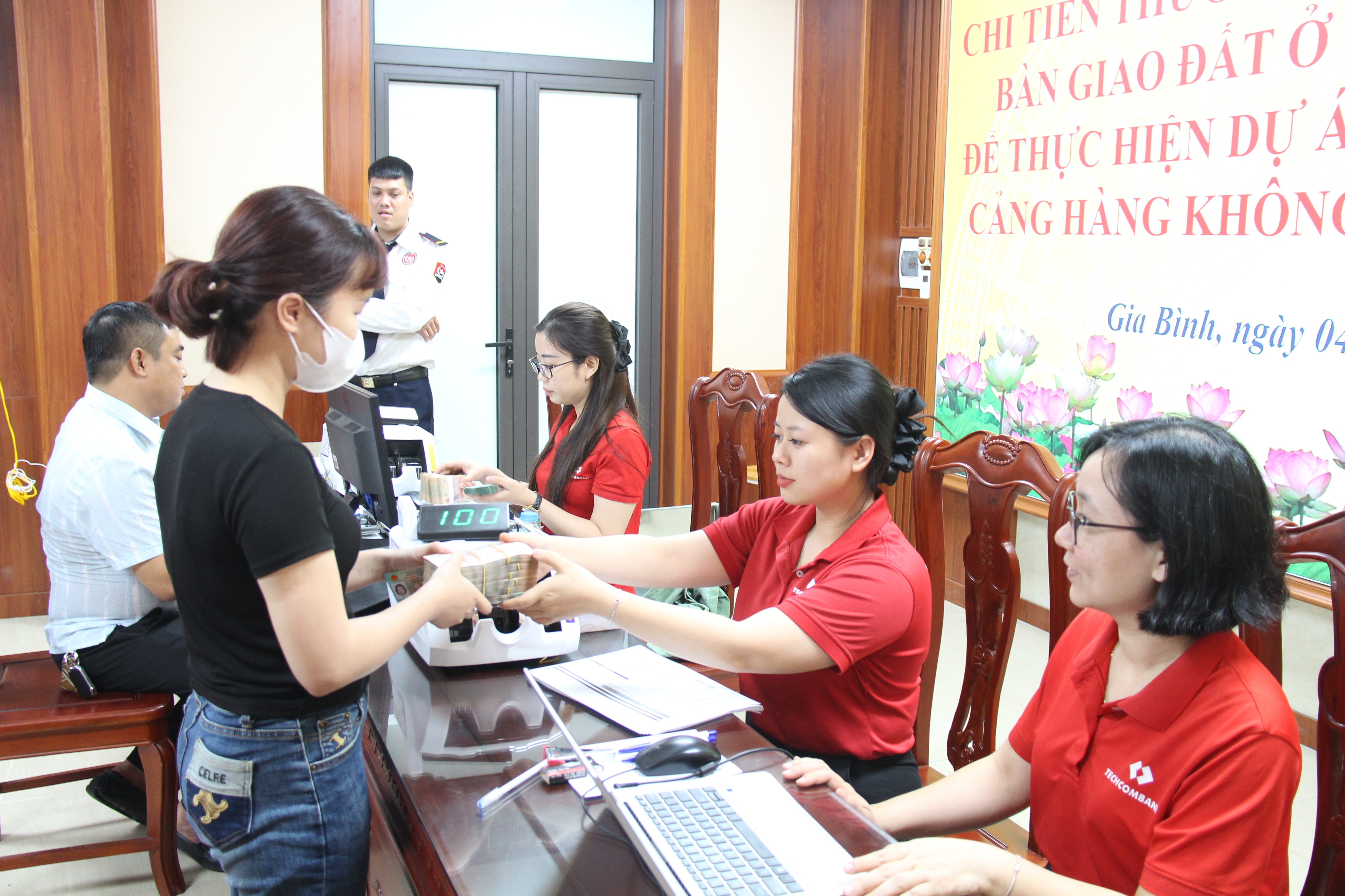 Người dân xã Gia Bình nhận tiền thưởng của nhà đầu tư khi bàn giao mặt bằng đất ở sớm. |