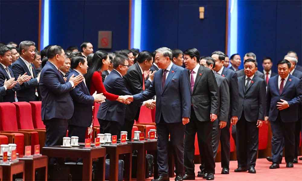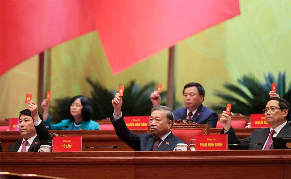 Tổng Bí thư Tô Lâm cùng lãnh đạo Đảng, Nhà nước giơ thẻ đảng biểu quyết tại Đại hội Đảng XIV. |