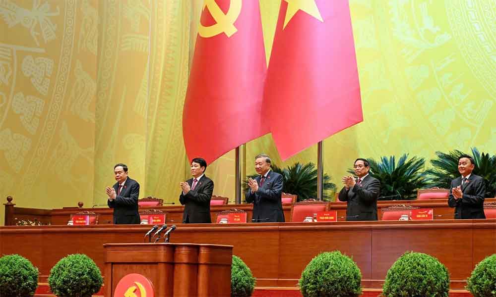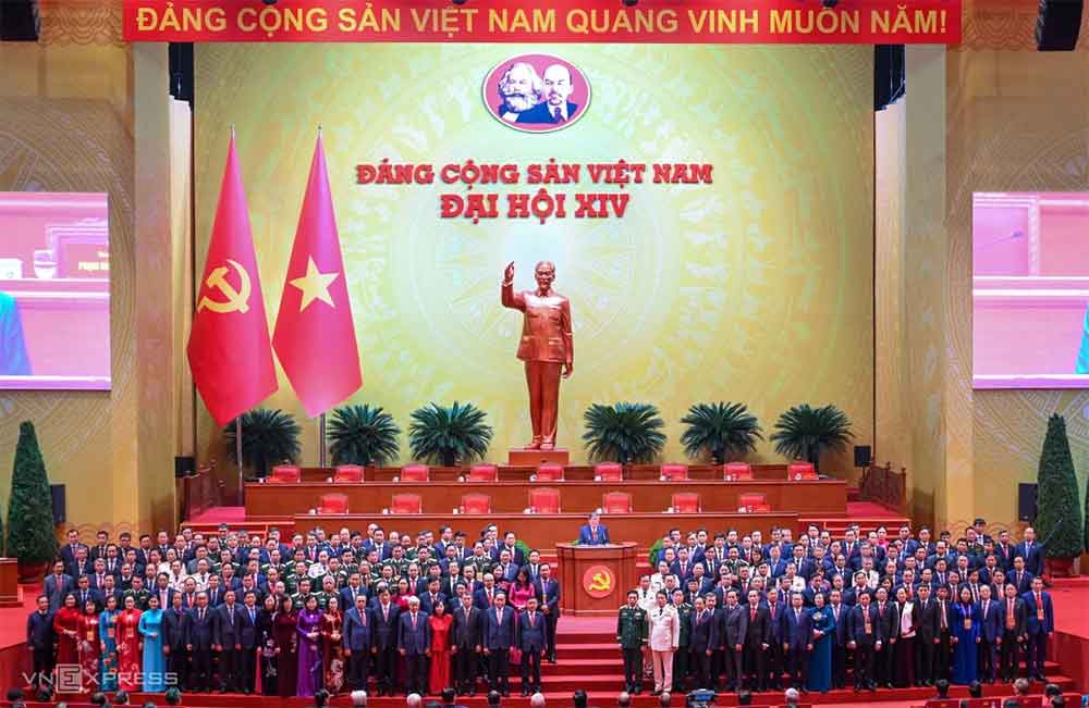 Lãnh đạo chủ chốt Đảng và Nhà nước tại Đại hội XIV, gồm: Tổng Bí thư Tô Lâm, Chủ tịch nước Lương Cường, Thủ tướng Phạm Minh Chính, Chủ tịch Quốc hội Trần Thanh Mẫn và Thường trực Ban Bí thư Trần Cẩm Tú. |