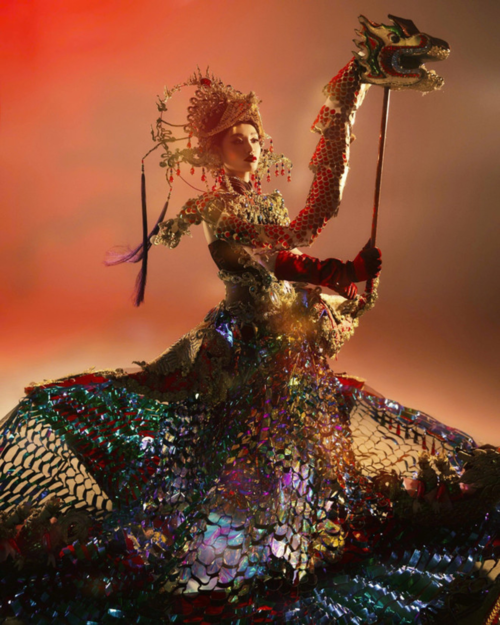 Trên sân khấu, “Thăng Long Hội” với phần khung bao quanh thân váy được mạ vàng và chạm khắc hoa văn tinh xảo, phần thân váy bên trong phản chiếu ánh sáng rực rỡ khi di chuyển, kết hợp đạo cụ tái hiện hình ảnh con rồng trong nghệ thuật múa rối nước truyền thống. Tổng thể tạo nên hiệu ứng thị giác sống động.
