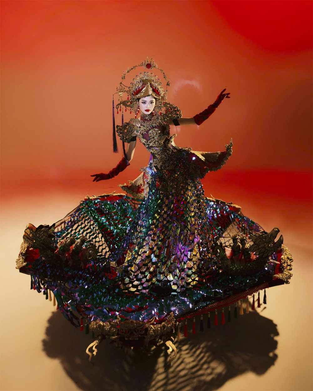 Đại diện Việt Nam - Hoa hậu Nguyễn Thị Yến Nhi tự hào quảng bá nghệ thuật múa rối nước dân gian Việt Nam đến với bạn bè quốc tế thông qua bộ trang phục “Thăng Long hội.”