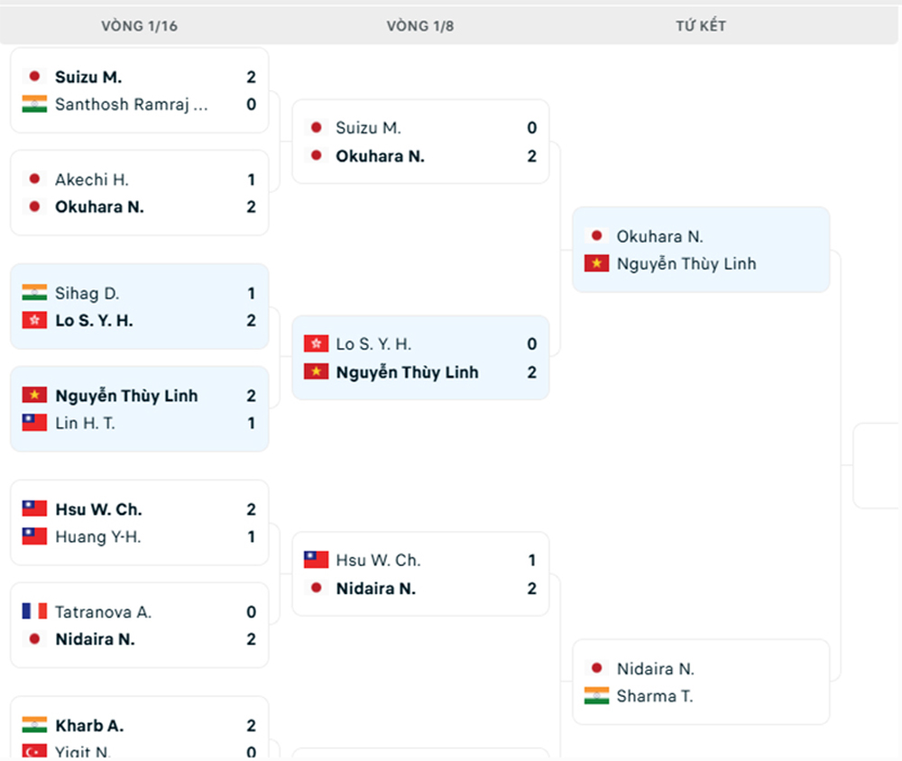 Giành quyền vào tứ kết, Thùy Linh sẽ đối mặt thử thách lớn mang tên Nozomi Okuhara – hạt giống số 5 của giải, hiện xếp hạng 20 thế giới. Tay vợt Nhật Bản vừa vượt qua Manami Suizu với tỷ số 2-0 (21-19, 21-11). Trận đấu giữa Thùy Linh và Okuhara dự kiến diễn ra vào lúc 16 giờ ngày 20/3.