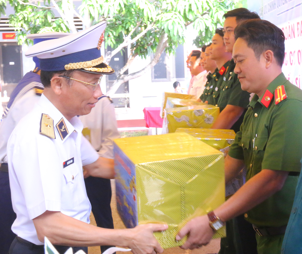 Chuẩn đô đốc Ngô Văn Thành, Bí thư Đảng ủy, Chính ủy Vùng 5 Hải quân tặng quà cán bộ, chiến sĩ và các lực lượng tại đảo Hòn Đốc. |