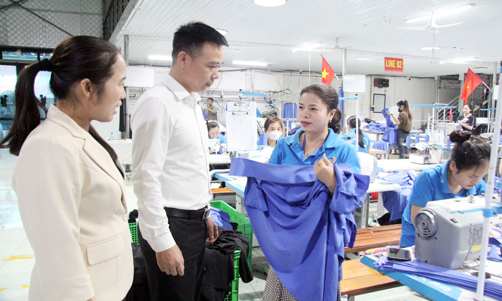 Lãnh đạo Phòng Kinh tế xã Hoàng Vân nắm bắt tình hình sản xuất, kinh doanh tại Công ty cổ phần May thời trang Hà An. |