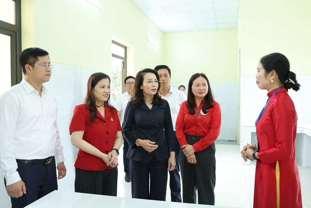 Đồng chí Nguyễn Thị Hương và các đại biểu tham quan công trình bếp ăn bán trú. |
