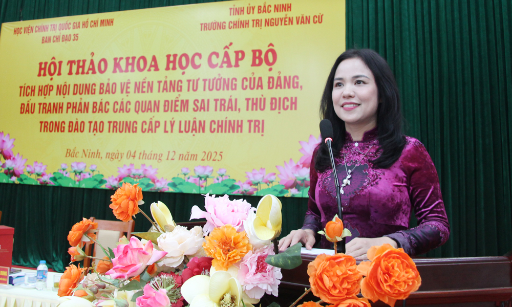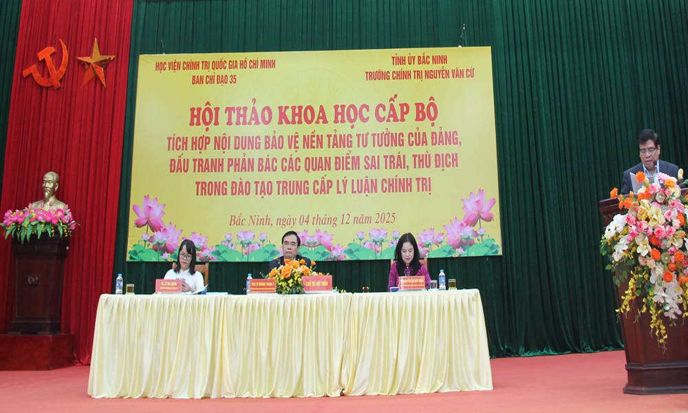 BẮC NINH - Ngày 4/12, Học viện Chính trị quốc gia Hồ Chí Minh phối hợp với Trường Chính trị Nguyễn Văn Cừ (tỉnh Bắc Ninh) tổ chức Hội thảo khoa học cấp Bộ chủ đề: “Tích hợp nội dung bảo vệ nền tảng tư tưởng của Đảng, đấu tranh phản bác các quan điểm sai trái, thù địch trong đào tạo Trung cấp lý luận chính trị”.