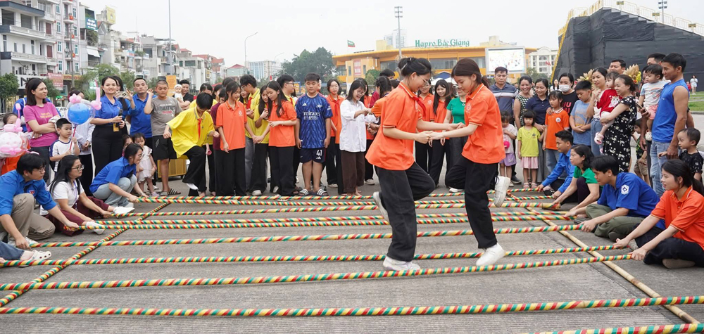 Thanh, thiếu niên tham gia trò chơi dân gian nhảy sạp tại Quảng trường 3/2. |