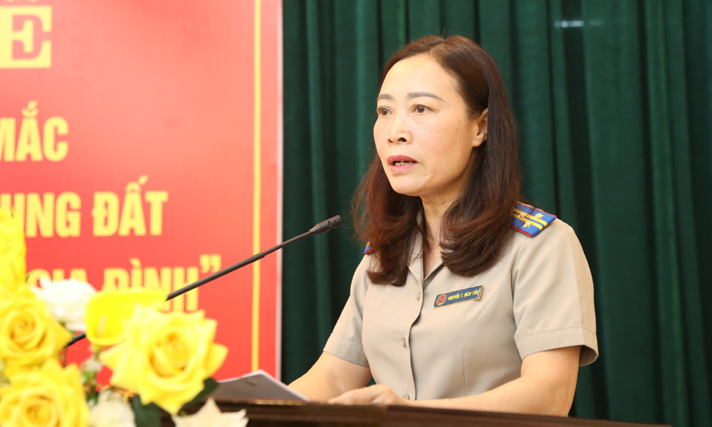 Đồng chí Nguyễn Thị Bích Tần, Cục trưởng Cục THA dân sự tỉnh phát biểu ý kiến. |