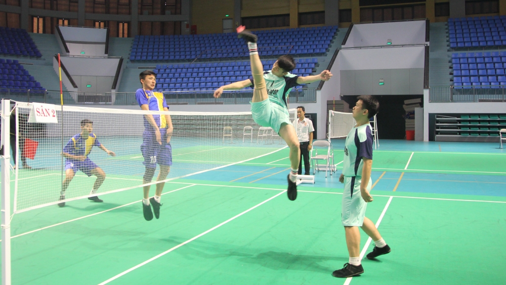 Đội Tân Yên (áo trắng) gặp đội Lục Nam (áo vàng) ở nội dung đội 3 nam vô địch tại Giải vô địch đá cầu năm 2021. |