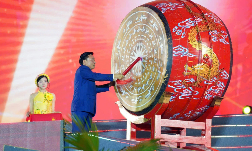 Đồng chí Nguyễn Huy Ngọc, Phó Chủ tịch UBND tỉnh Phú Thọ đánh trống khai mạc. |