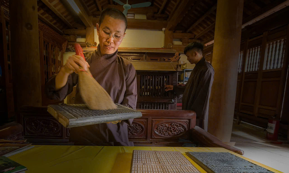 Bảo quản mộc bản ở chùa Vĩnh Nghiêm. Ảnh: Khắc Hường. |