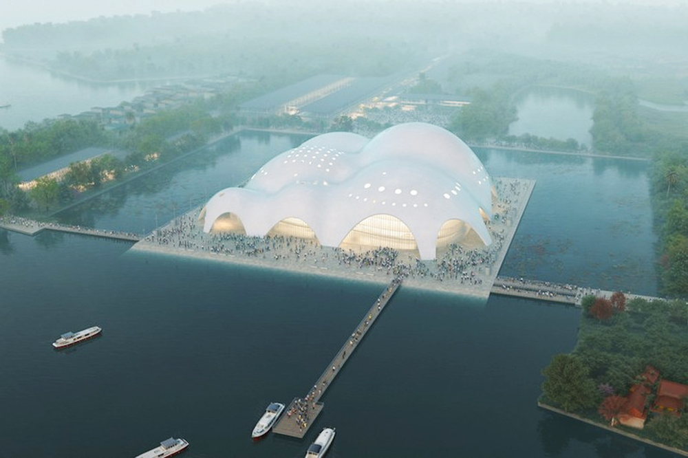 Dấu ấn đặc biệt của nhà hát chính là kiến trúc mái vòm có kết cấu siêu mỏng, siêu chịu lực và được phủ lên lớp vật liệu tạo hiệu ứng ngọc trai có thể phản chiếu màu sắc mặt nước Hồ Tây theo thời gian trong ngày.