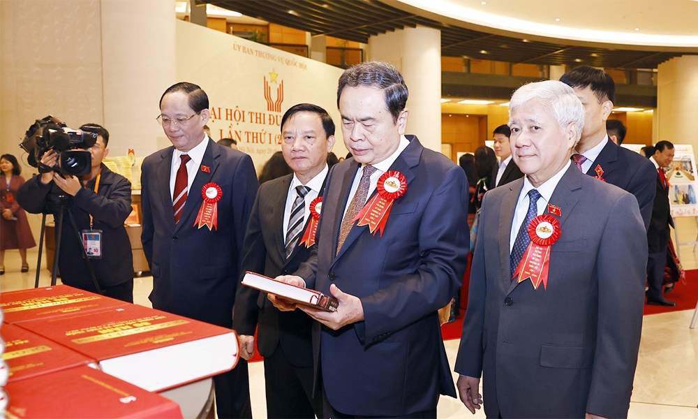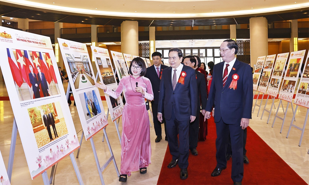 Chủ tịch Quốc hội Trần Thanh Mẫn và lãnh đạo Quốc hội xem Triển lãm Uỷ ban Thường vụ Quốc hội với phong trào thi đua yêu nước. |